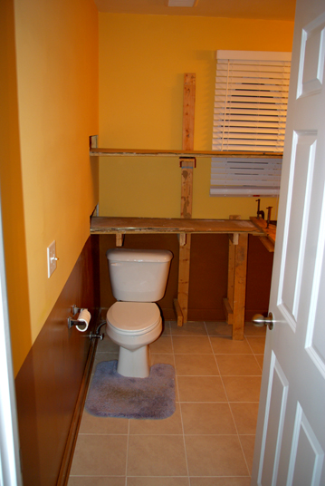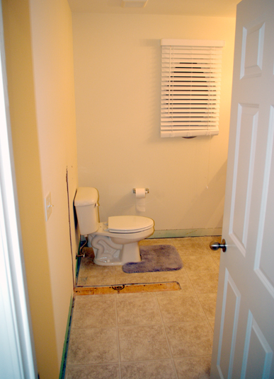 removing the builder-grade linoleum, the toilet will be rotated 90 degrees